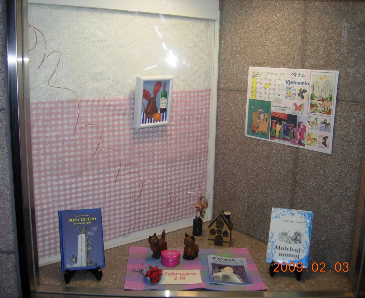 | 2月はバレンタイン。ハート型のチョコレート容器が焦点です。 壁の永井厚子の静物画。堀泰雄のカレンダーはベトナム。 図書は Bona Espero と Malvivaj Animoj (ゴーゴリ著,死せる魂)です。 Ĉar la monato Februaro enhavas la tagon de Sankda Valenteno, enfokusiĝas Korforma skatolo de ĉokolado. Pentraĵo de s-ino NAGAI Atuko en la muro. Kalendaro farita de s-ro HORI Yasuo temas pri Vjetnamio. Prezentataj libroj estas "Bona Espero" kaj "Malvivaj Animoj". |