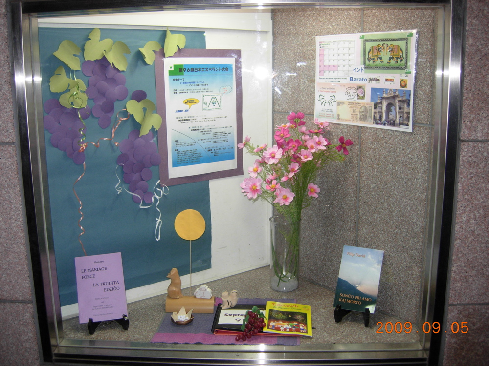Edziĝo と,Sonĝo pro amo kaj morto です。 Vinberoj kaj kosmosoj. La afiŝo pri la japana kongreso de Kôfu ĉefrolas. Kato suprenvidas plenan lunon, ankaŭ leporo kaj sciuro vidas ĝin. Moĉio (rizkuko) estas oferita. Prezentitaj libroj estas "La Trudita Edziĝo", dramo de Molière, kaj "Sonĝo pro amo kaj morto". |