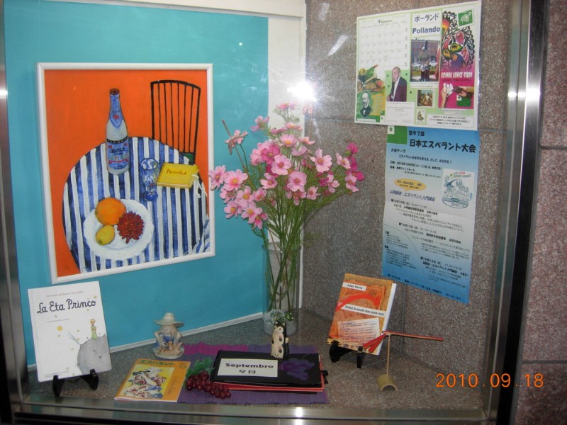 | 大判の静物画が目を惹きます。一杯のコスモスの合間を赤トンボが飛びます。右下にも大型の竹細工の赤トンボ。カレンダーはポーランド。床には猫がすっくと立ち,葡萄が秋の豊穣を呼び込んでくれるでしょう。図書は新装なった「星の王子様」と,気っぷの良い訳文で楽しめる「80日間世界一周」です。 長崎での日本大会のポスターを右の壁に追加しました。(9月18日) ------------------------------- 事務局の運営時間: 火曜~土曜の午前10時~午後6時 (日曜、月曜、祝日は休業、催しがある日は開業) 飾り窓はエスペラント会館1階入り口の右側にあります。 La oficejo estas principe malfermita de la 10a atm ĝis la 6a ptm, de mardo ĝis sabato. Fermita en Dimanĉo, lundo kaj naciaj festtagoj. La montro-fenestro troviĝas dekstre de la enirejo de la Esperanto-Domo en Tokio. ◆ 主ページ(日本語)へ ◆ Al la Ĉefpaĝo (Esperante) |
