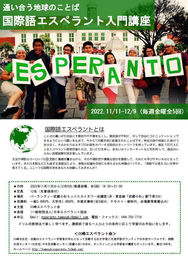11/11~12/9(金) 川崎:通いあう地球のことば 国際語エスペラント入門講座