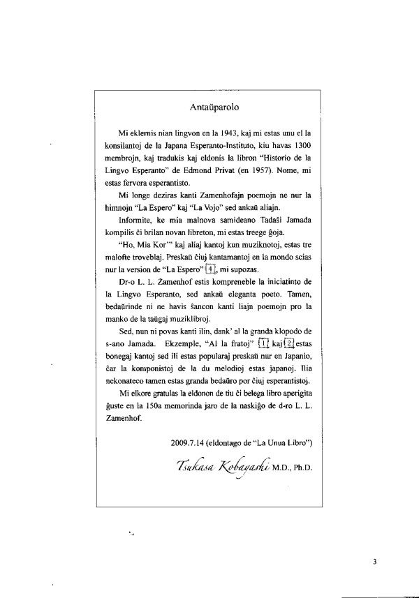 ザメンホフの原作詩と訳詩による歌22曲の楽譜が収められている。小林司氏の序文。