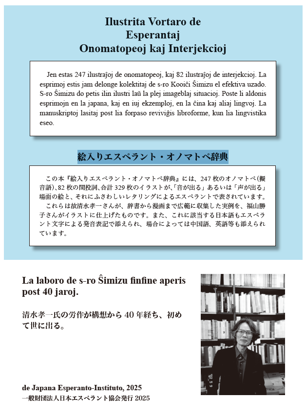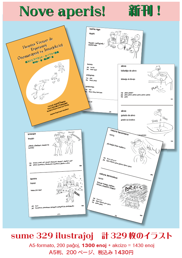 この度、(一財)日本エスペラント協会では Ilustrita Vortaro de Esperantaj Onomatopeoj kaj Interjekcioj (絵入りエスペラント・オノマトペ辞典)を発行しました。